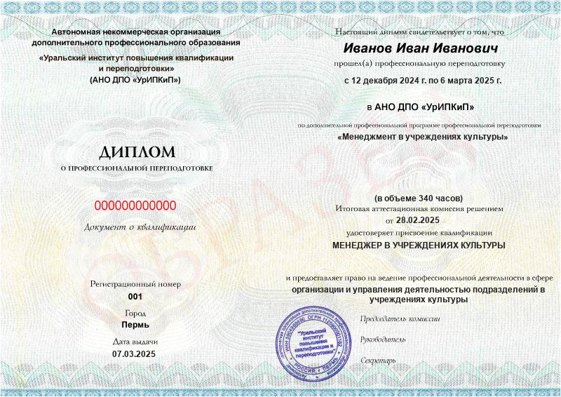 Да, дипломы и удостоверения оформляются в соответствии с действующим законодательством РФ. Документы печатаются на специальных бланках, заверяются печатью АНО ДПО «УрИПКиП».