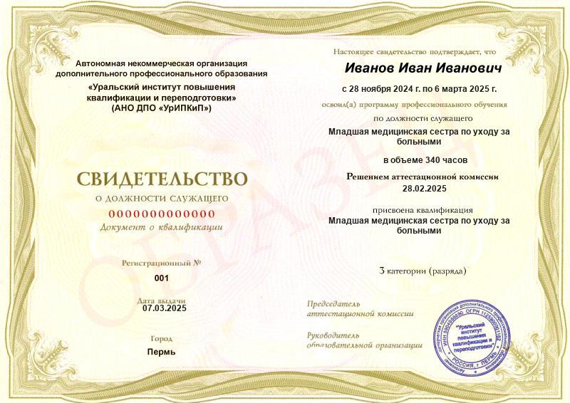 • Квалификация: Младшая медицинская сестра по уходу за больными